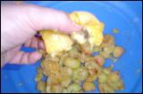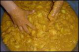 Dann beginnt die eigentliche Arbeit, denn das Obst muß zerkleinert werden. Bei unseren Haushaltsüblichen Mengen, zerquetschen wir das einfach mit den Händen und entfernen dabei auch gleich die Kerne. |